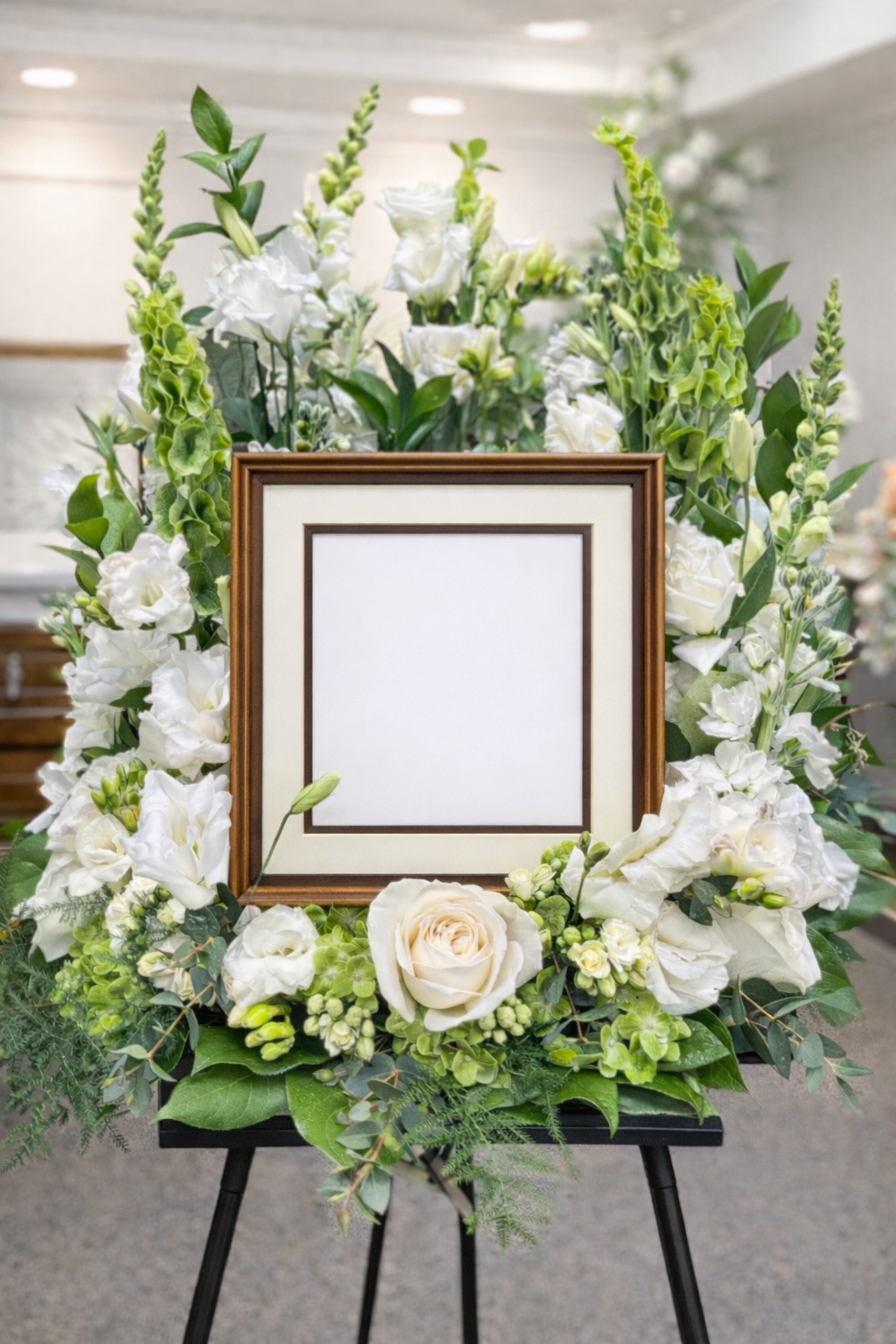 A graceful memorial arrangement featuring white roses, snapdragons, lisianthus, hydrangeas, and lush green foliage, elegantly encircling a decorative urn. The soft palette and natural textures create a serene tribute suitable for indoor remembrance settings.