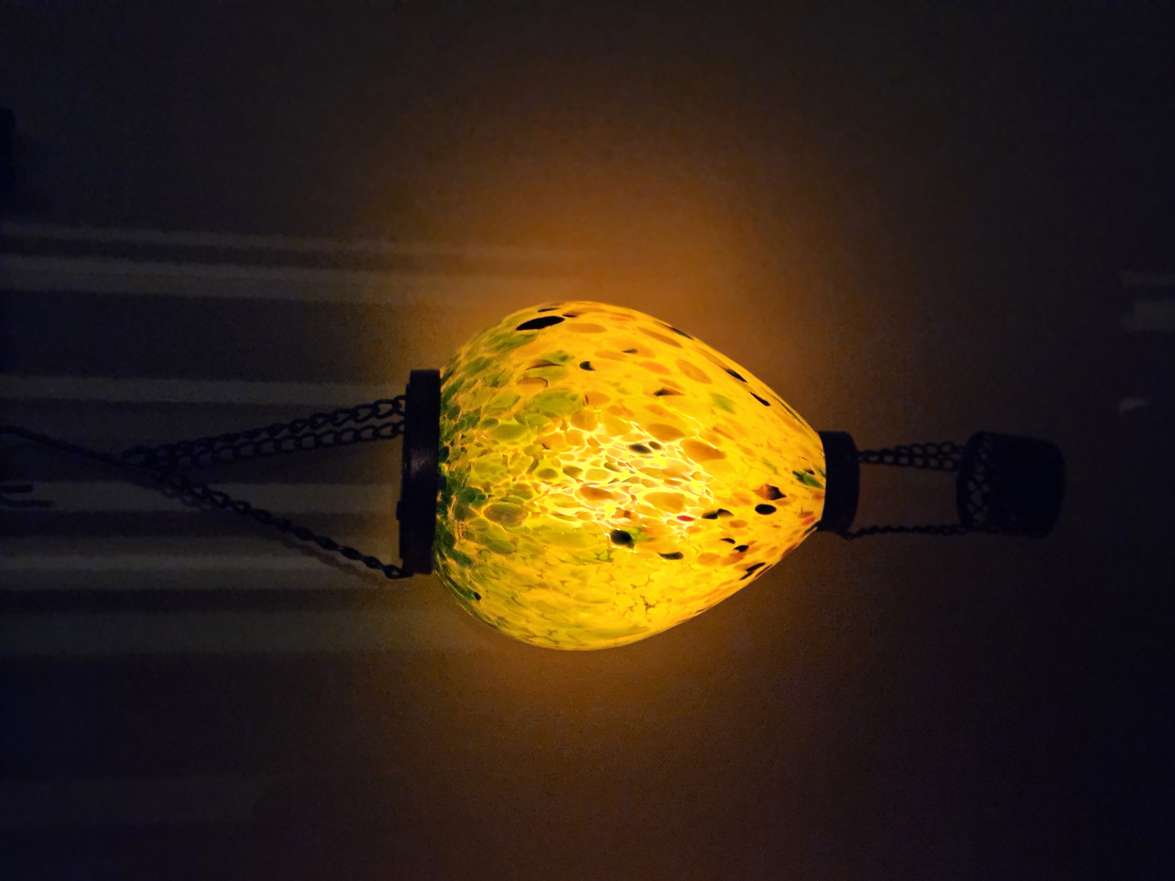 Brighten your garden or patio with this solar-powered hot air balloon lantern. Featuring colorful mosaic glass and a decorative metal basket, it charges during the day and automatically lights up at dusk. Easy to hang, it adds charm and ambient glow to any outdoor space. Approximately 18'' in Height
