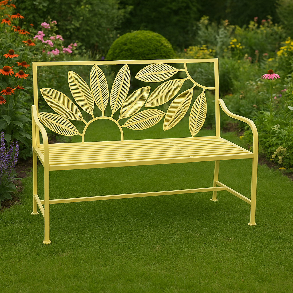 Add a cheerful touch to your outdoor space with this decorative yellow metal bench, featuring a stunning sunflower-inspired backrest design. Approximately 43''L x 18'' w x 36'' H